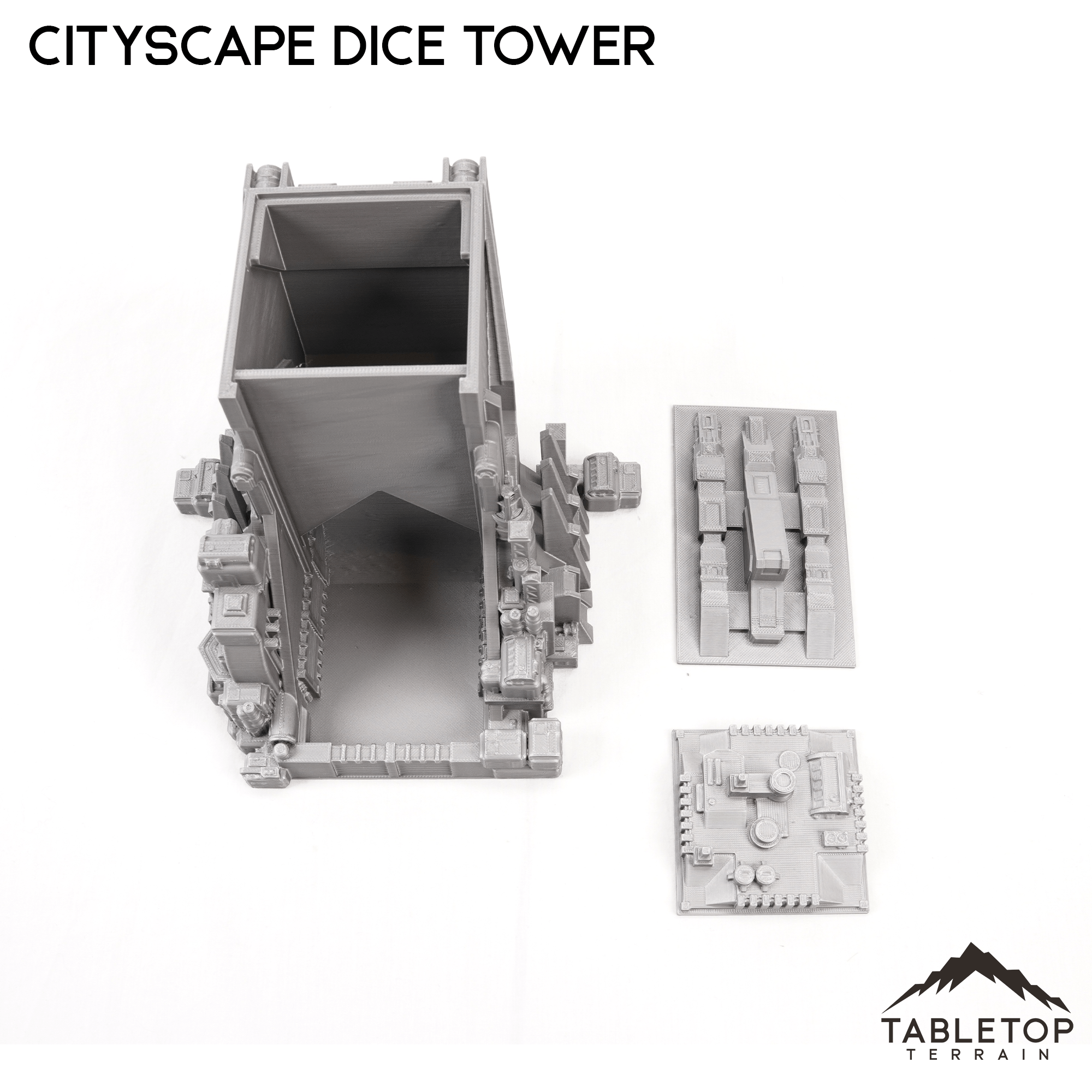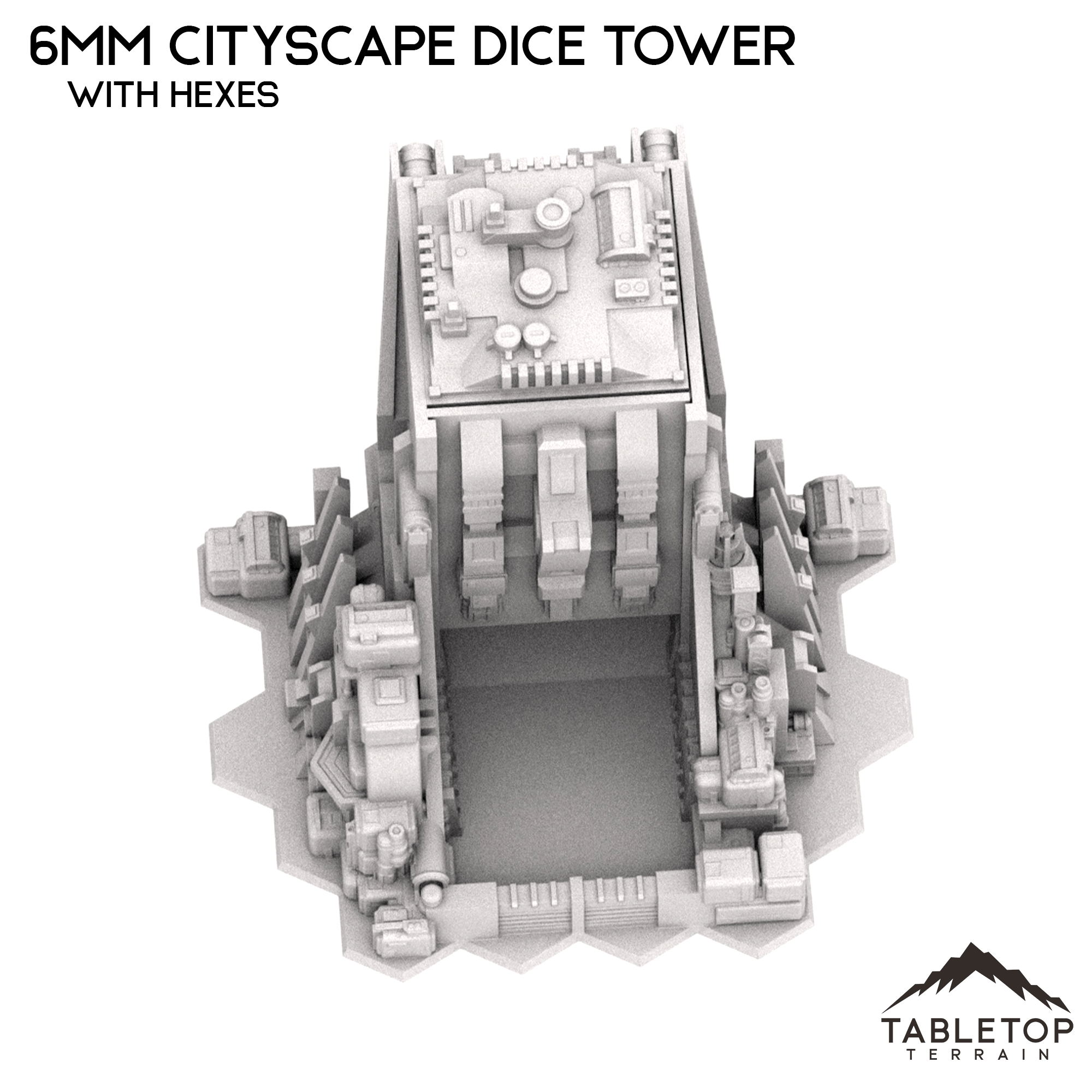 This 6mm scale Sci-Fi Cityscape Dice Tower fits in with the rest of the Cityscape terrain as a building and doubles as a dice tower. The top cap and front cap easily slide in and out without glue. It would work great in any 6mm mech scale tabletop wargame.