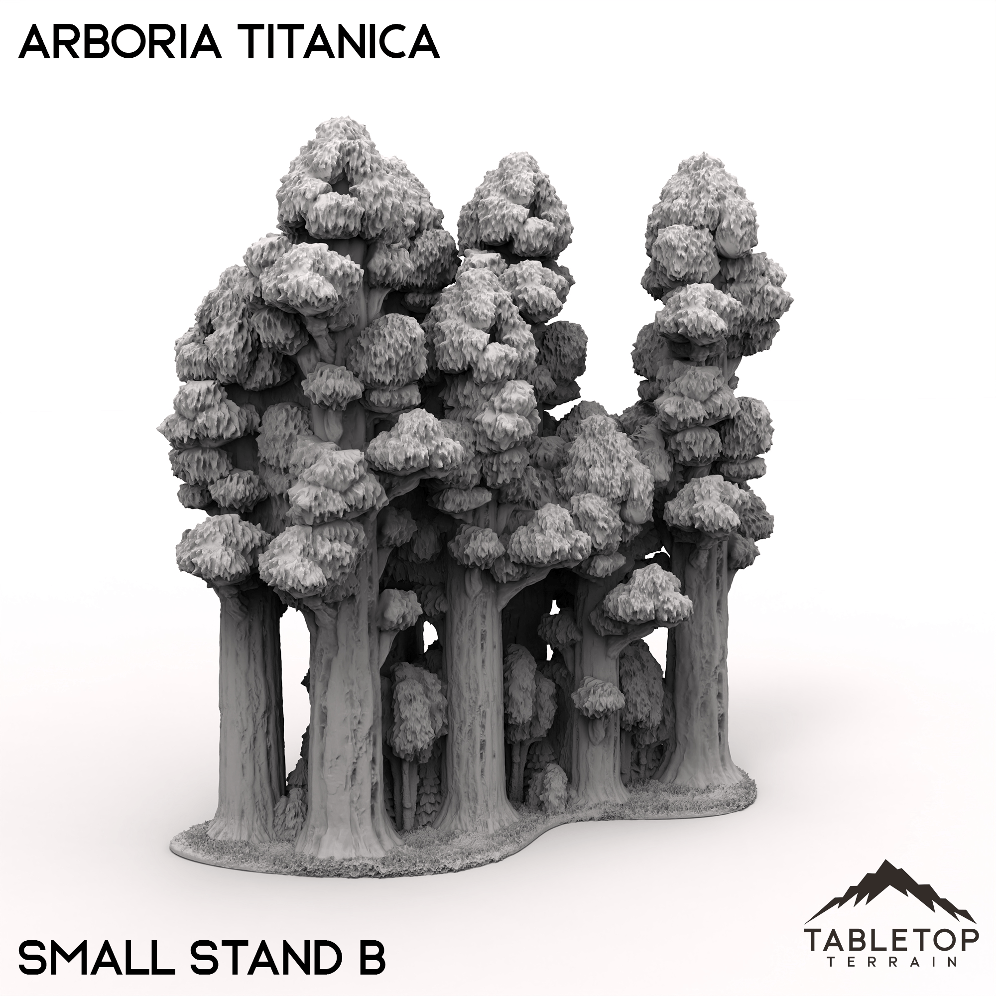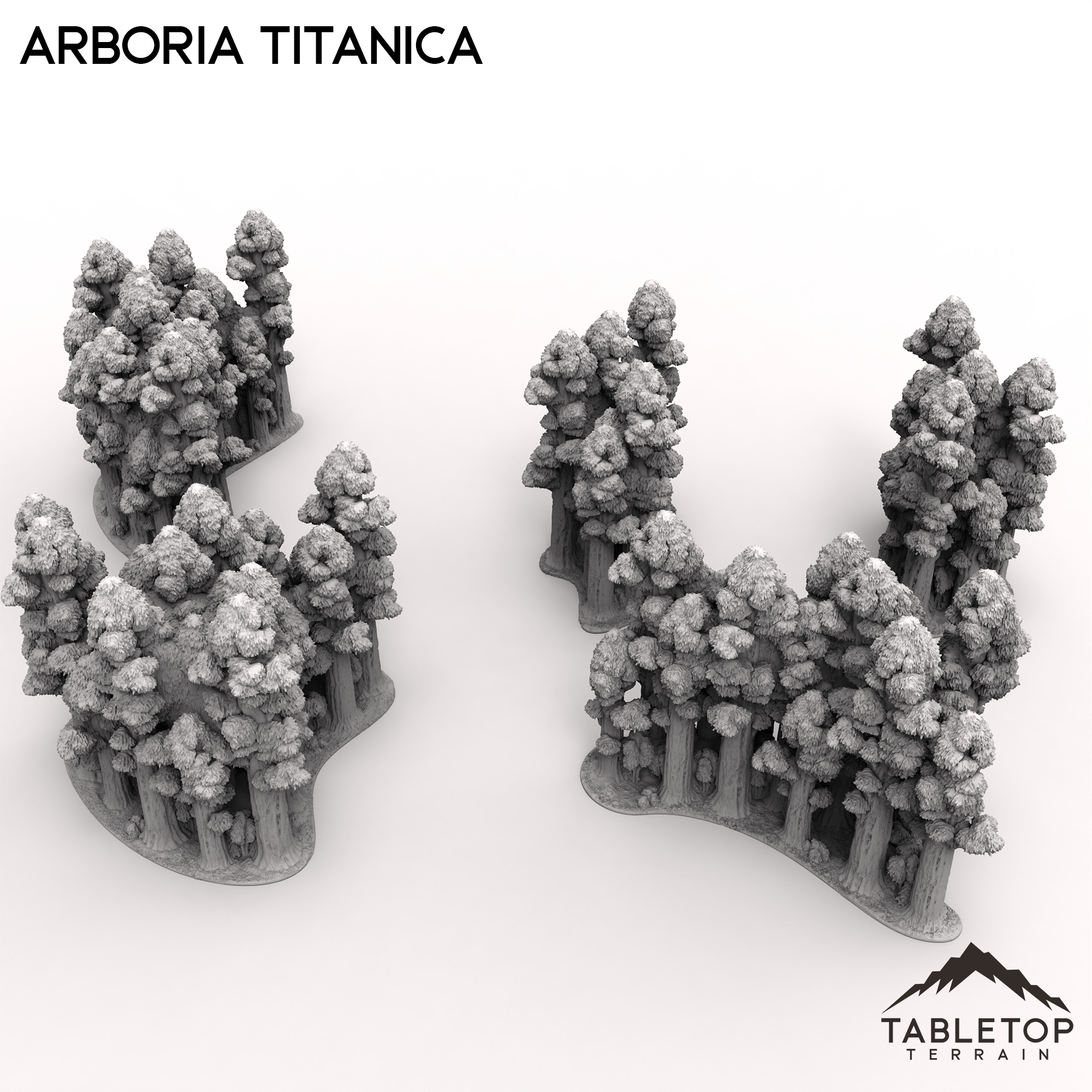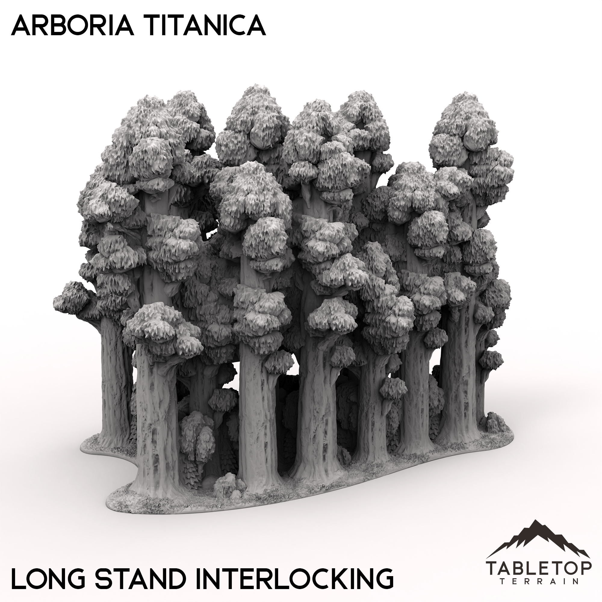 The Arboria Titanica is a collection of massive trees, made for 6-8mm tabletop games. Each grouping of tress is unique with 5 different total sets. Each set can be placed together, interlocking in a variety of ways to create a solid barrier of forest. Each and every tree is highly detailed from the base of the roots to the tips of the branches.