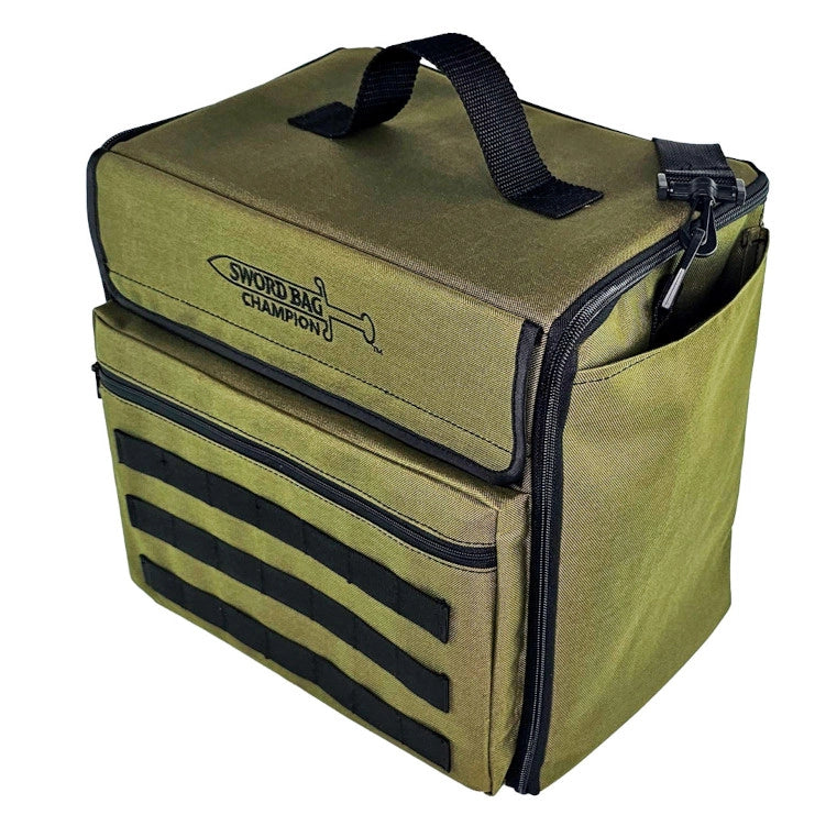 The Champion Sword Bag is built for gamers who need dependable storage at a great price. Crafted from durable olive-green canvas, this bag keeps your miniatures, rulebooks, and gaming accessories organized and protected. With spacious pockets and a customizable Molle system, this bag adapts to your gaming setup, making it perfect for game nights, tournaments, or everyday storage. The bag can fit 12.75 inches Battle Foam Small (BFS) size foam trays (11.5W x 7.75L").