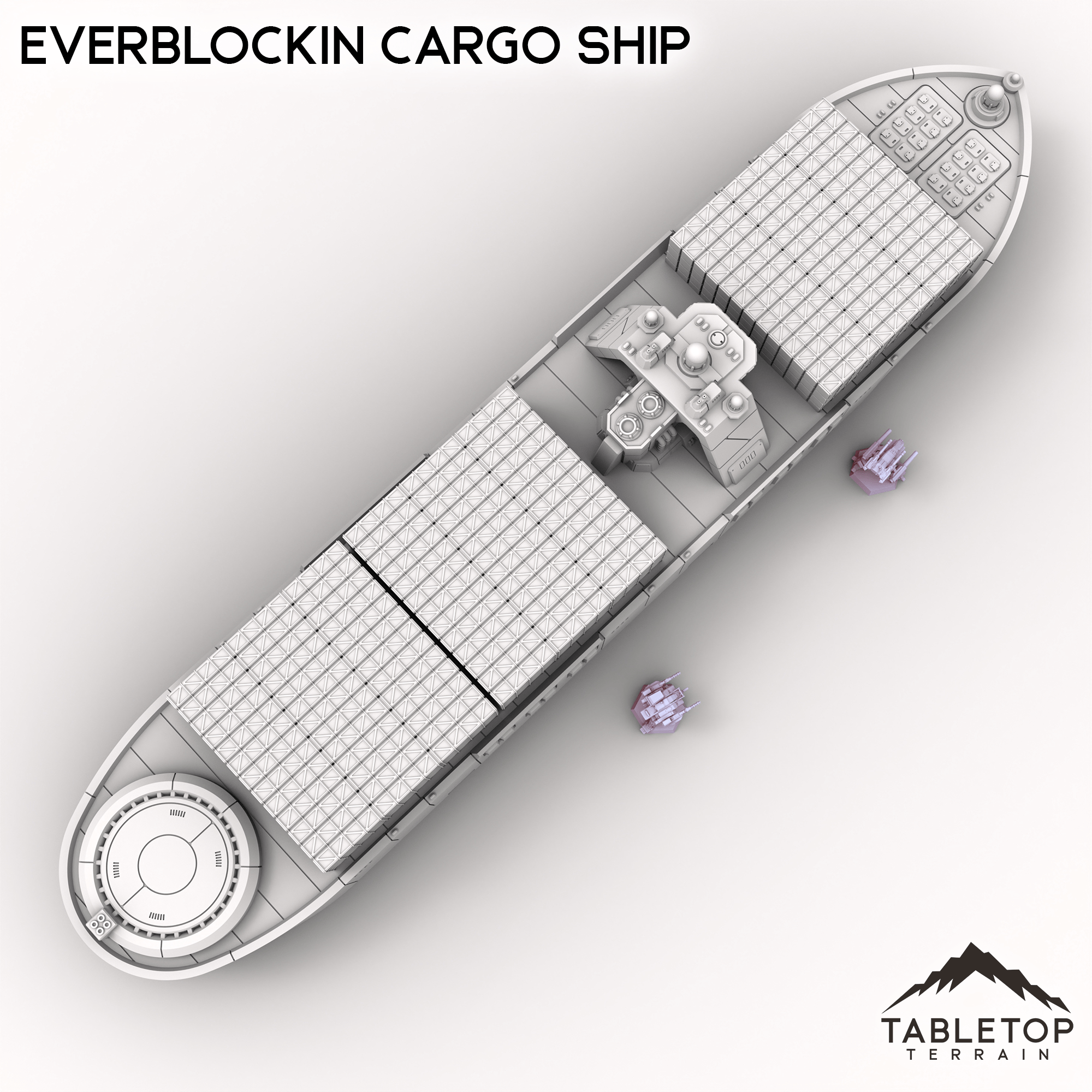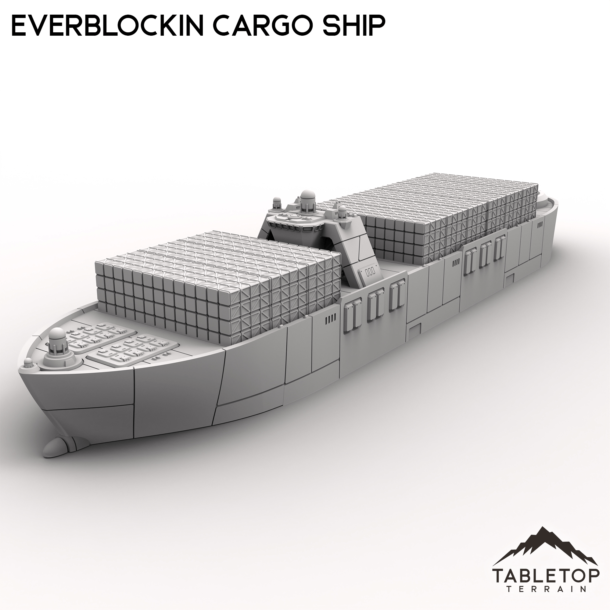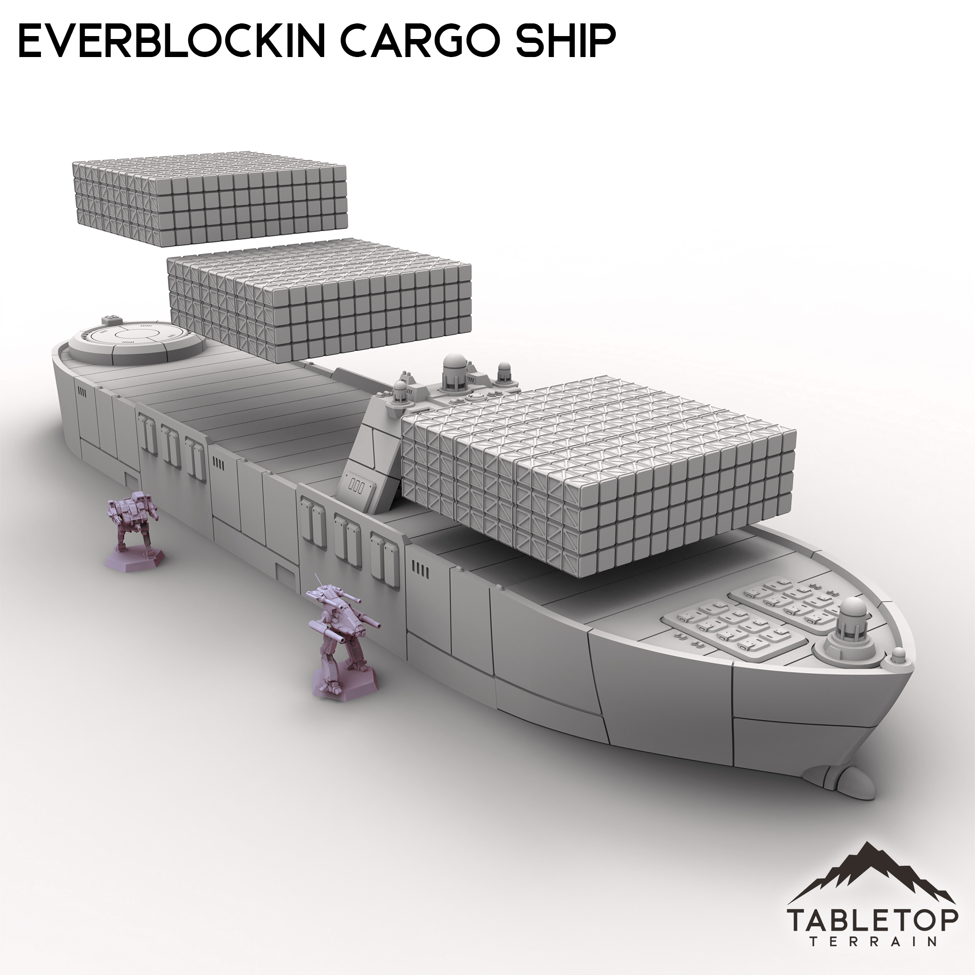 At more than 2-feet long, the Everblockin Cargo Ship is a massive set piece! The set features removable cargo stacks, a detailed bridge, and a platform perfect for a mech on the ship's stern. Just take care piloting this ship, as the massive size may prove hazardous for any smaller canals or waterways... This set is scaled for mech games and 6mm games, but could be used for a variety of sci-fi or cyber punk tabletop games if you'd prefer.