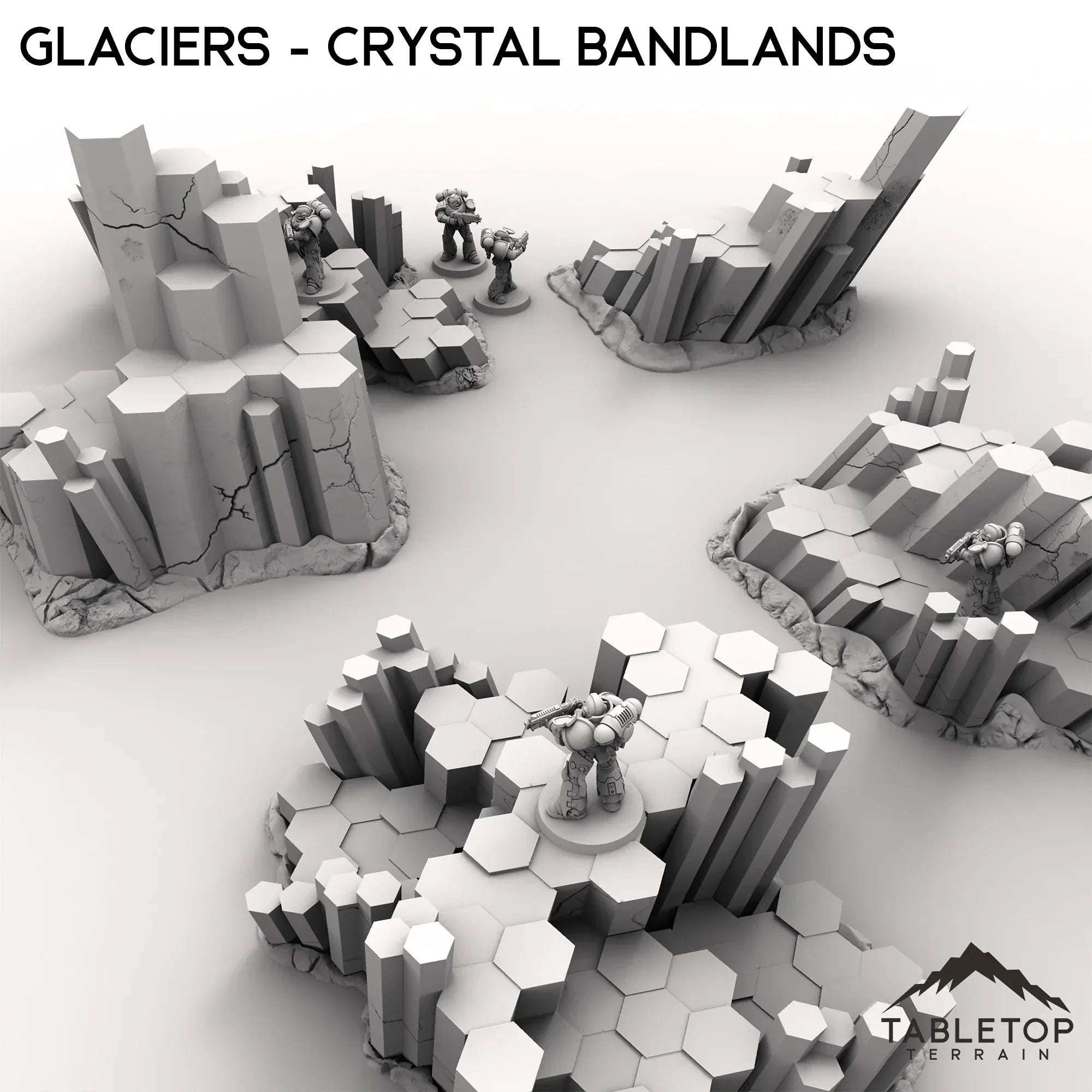 Glaciers is a set of large, chunky crystals growing out of the ground. They are sized to allow minis to be set on the platforms, or to work as large pieces of cover. They are designed for sci-fi games, but can be used for any genre of tabletop game. Consider combing them with other sets from the Crystal Badlands collection to fill out your tabletop!