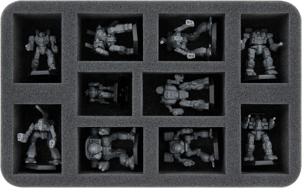 The foam tray with 10 compartments is ideal for medium-sized and large Mechs. The 16 compartments are suitable for smaller MechWarrior models.