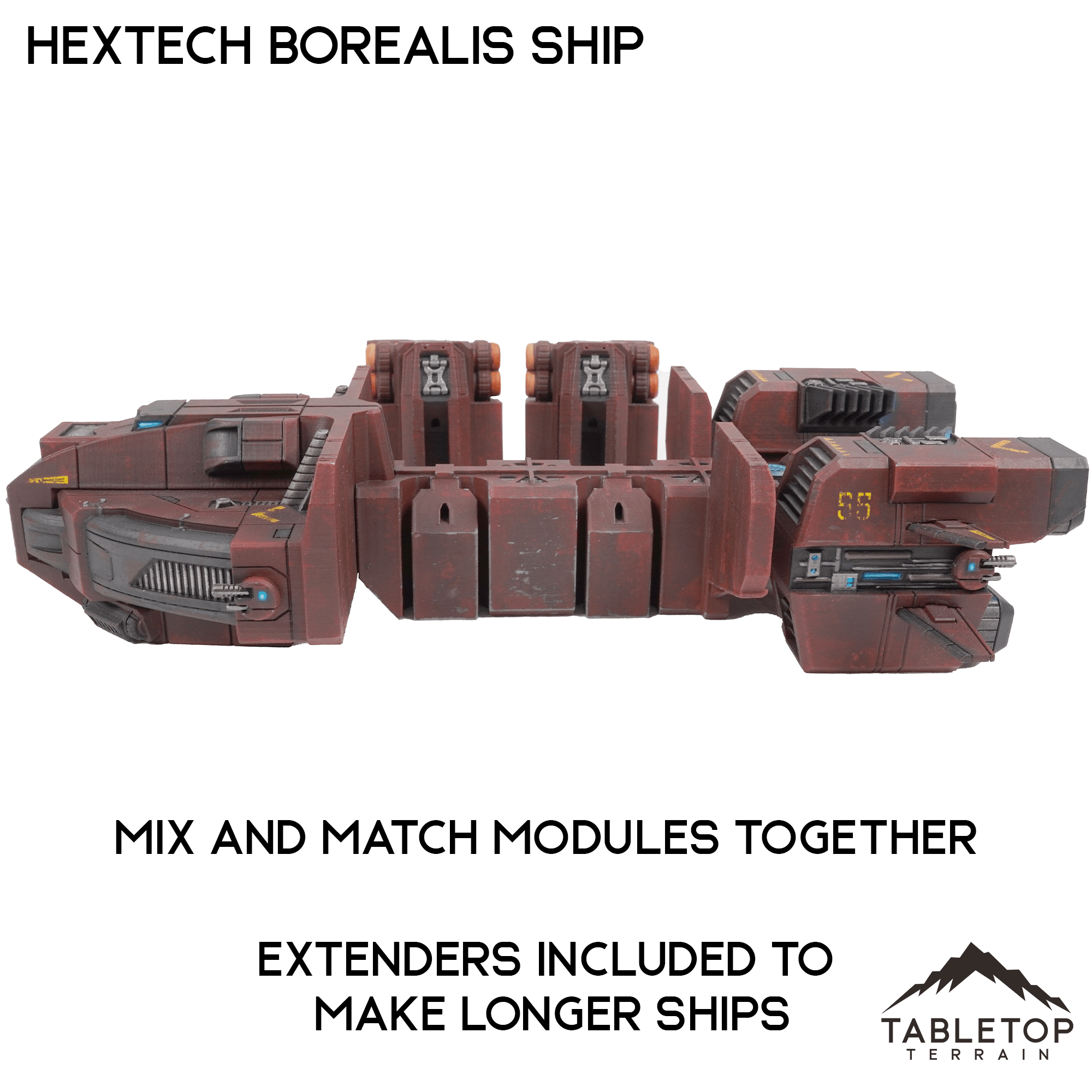 Transport your Mechs in Style! The HEXTECH Borealis Ship is a large transport and cargo craft, with fully-modular pod bays for different attachments. This fully modular ship is a stylish and playable on the table!
