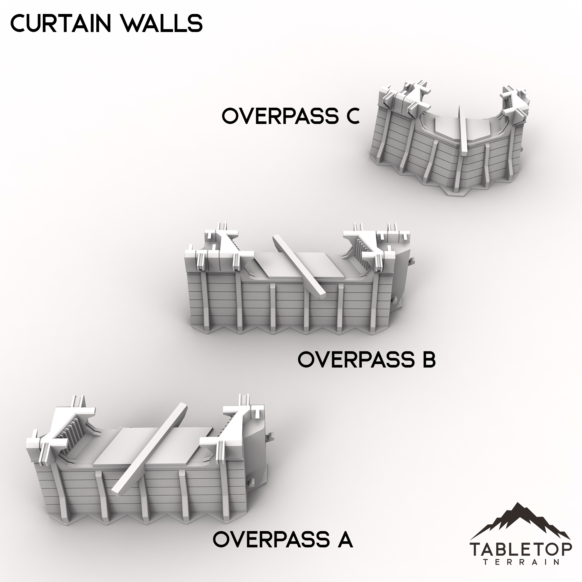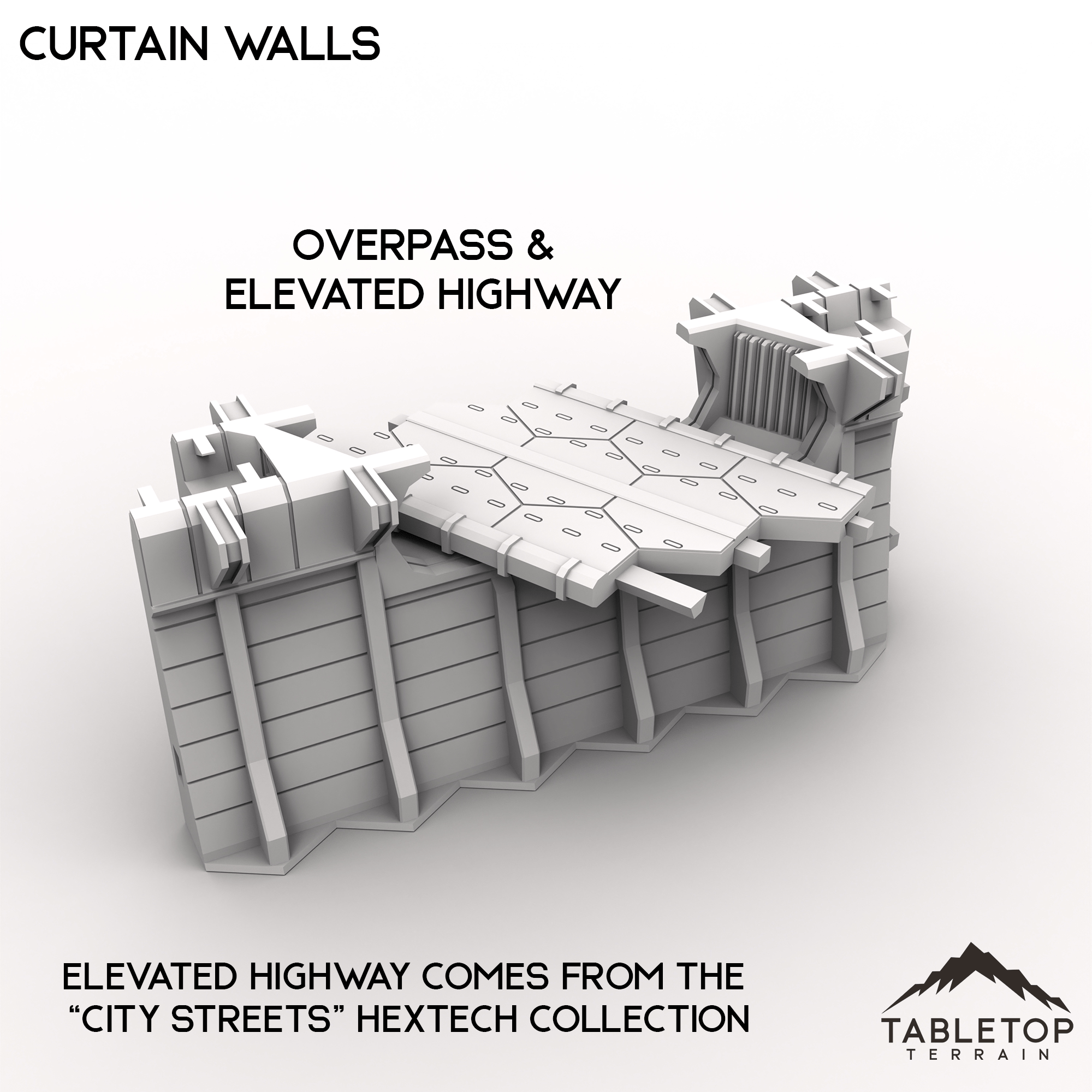 The Overpass pieces are special, and are made to match with the Elevated Highway pieces from the HEXTECH City Streets set, also a part of the Trinity City collection. They can be used freely with any other piece from the Curtain Walls set but feature a lowered platform for resting the City Streets Highway pieces onto.