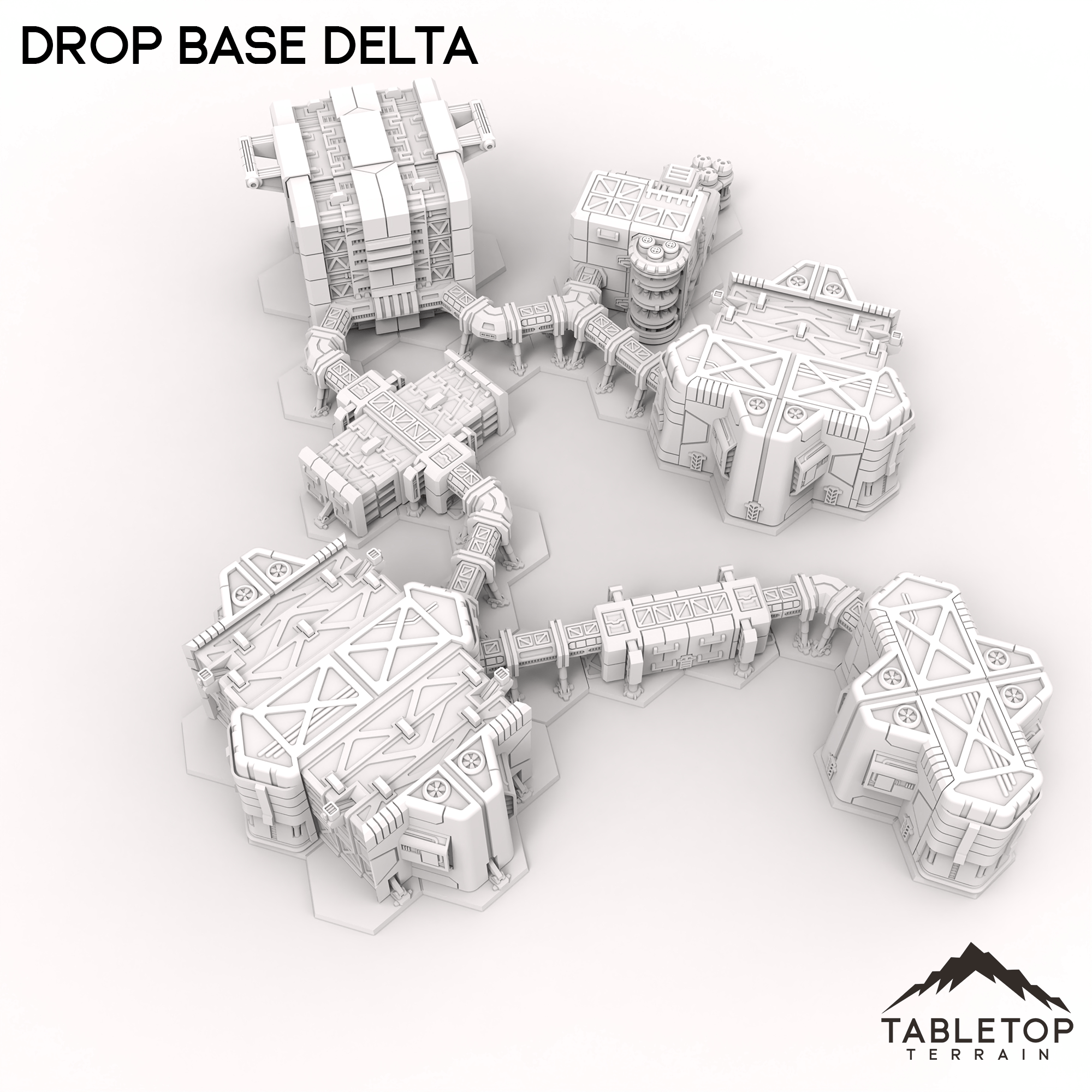HEXTECH Drop Base Delta is a set of prefab buildings, including personnel quarters and power supply. The set includes corridors for attached the buildings in any way you need for your tabletop. The styling of the Drop Base Delta set is made to match the look and feel of the Trinity City collection as well.