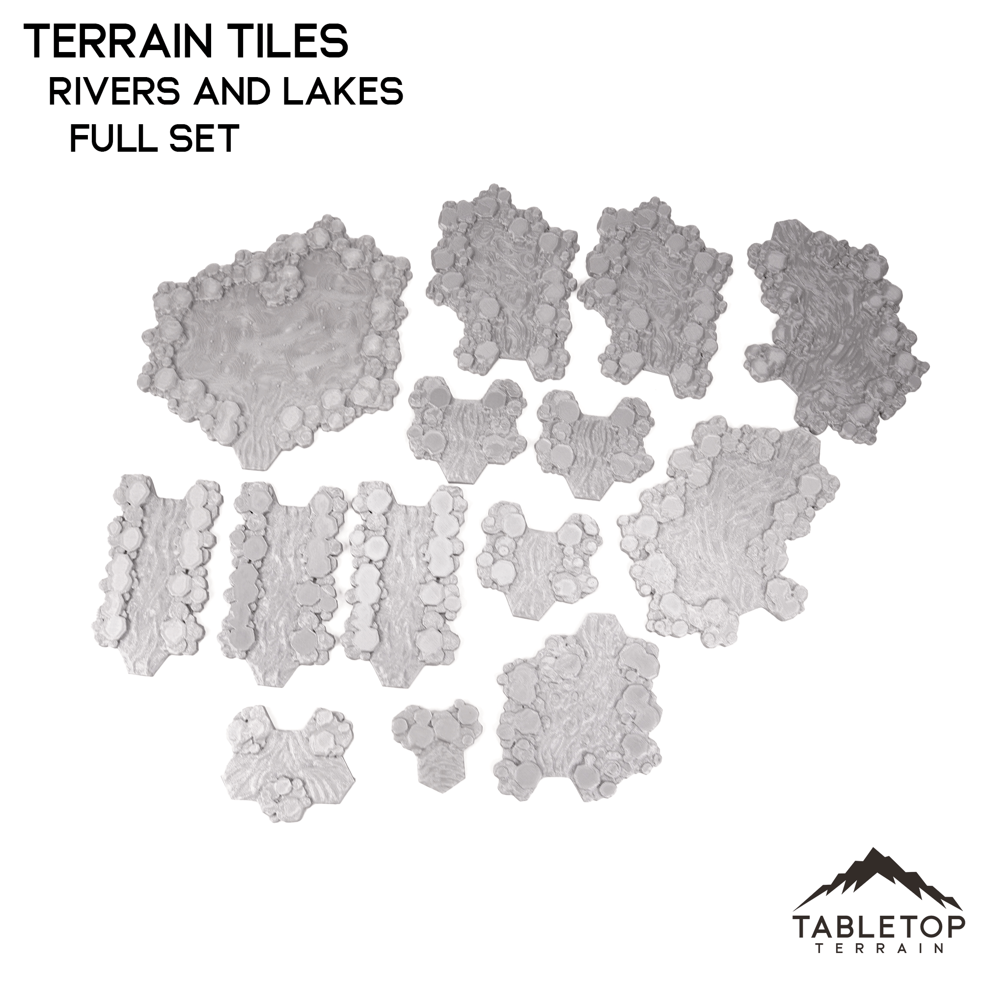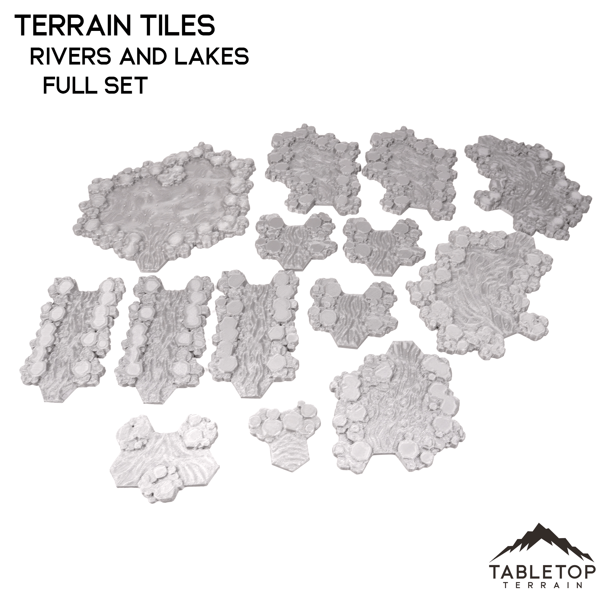 The Rivers and Lakes Terrain Tiles is a set of hexed water features for use on your Hextech tables. They are fully modular and do not glue together so they can be used in many different table layouts.