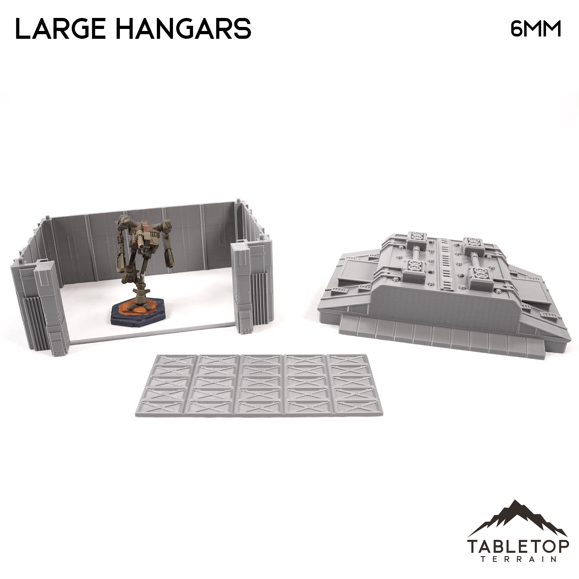 The Mecha City Large Hangars Set includes two massive hangars for vehicles and mechs. Both hangars have removable roofs, and the smaller hangar also has a removable bay door. It would work great in any 6mm mech scale tabletop wargame.
