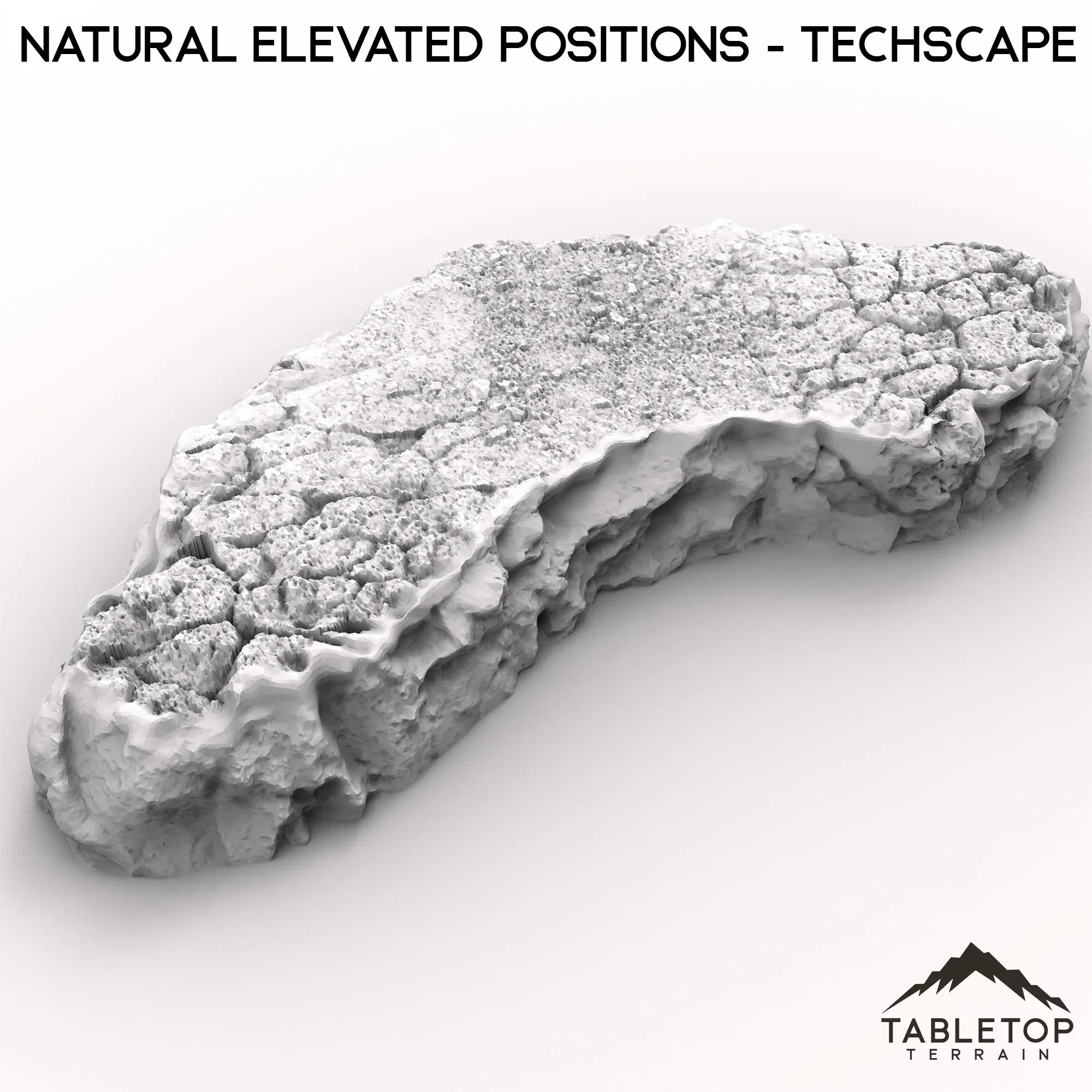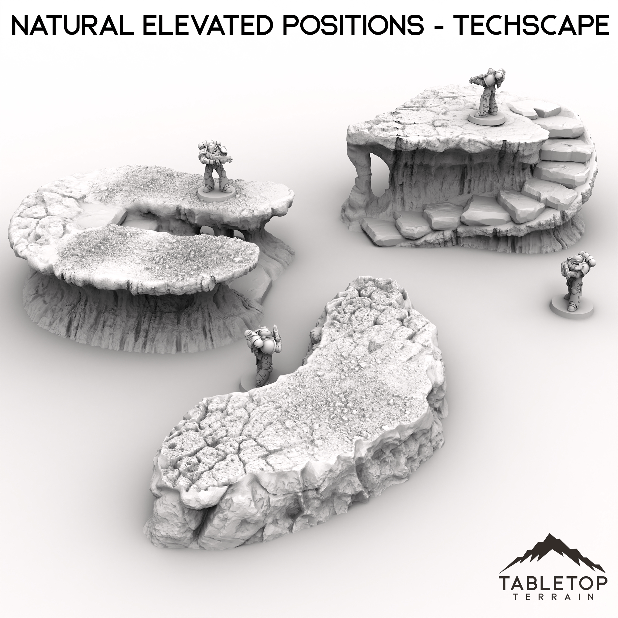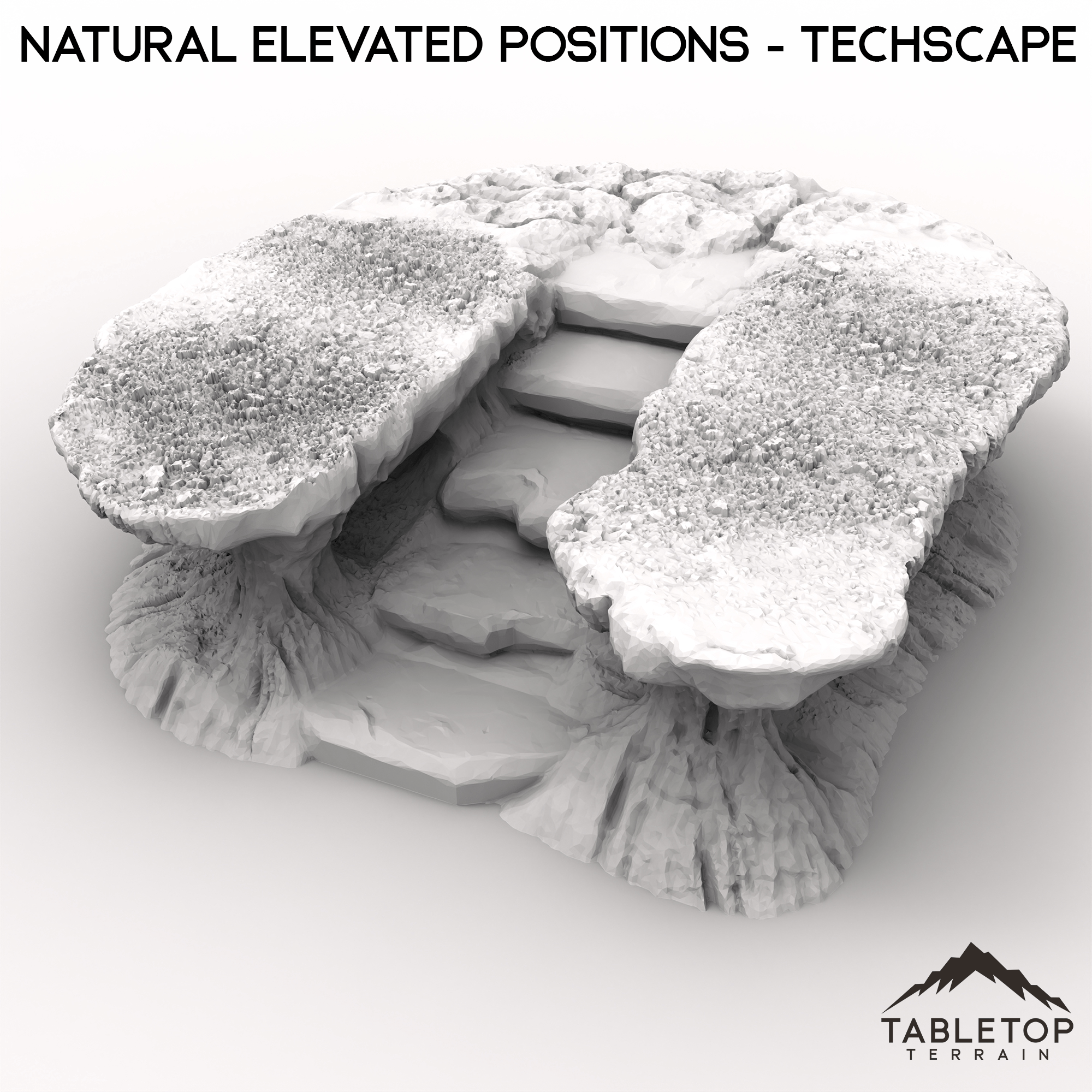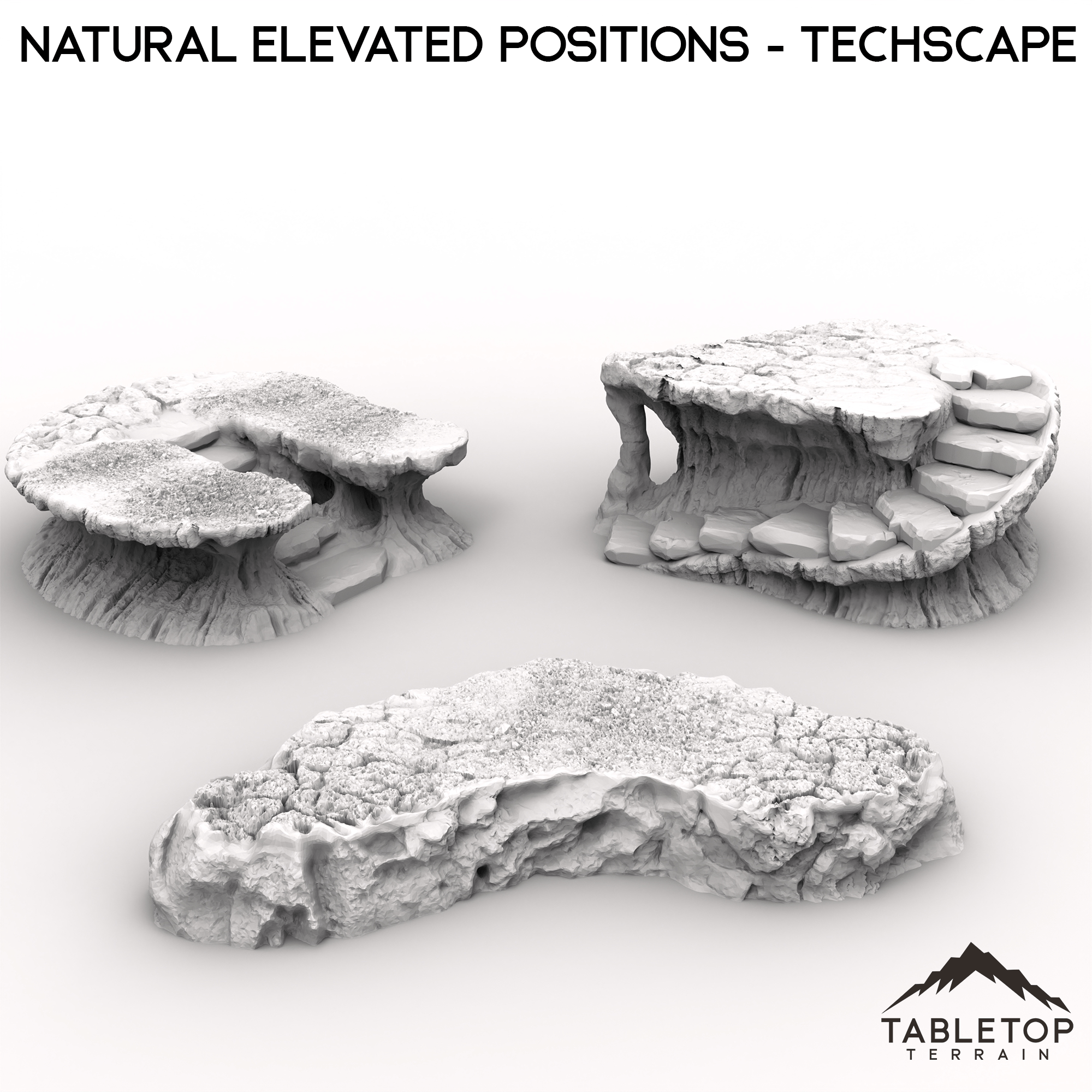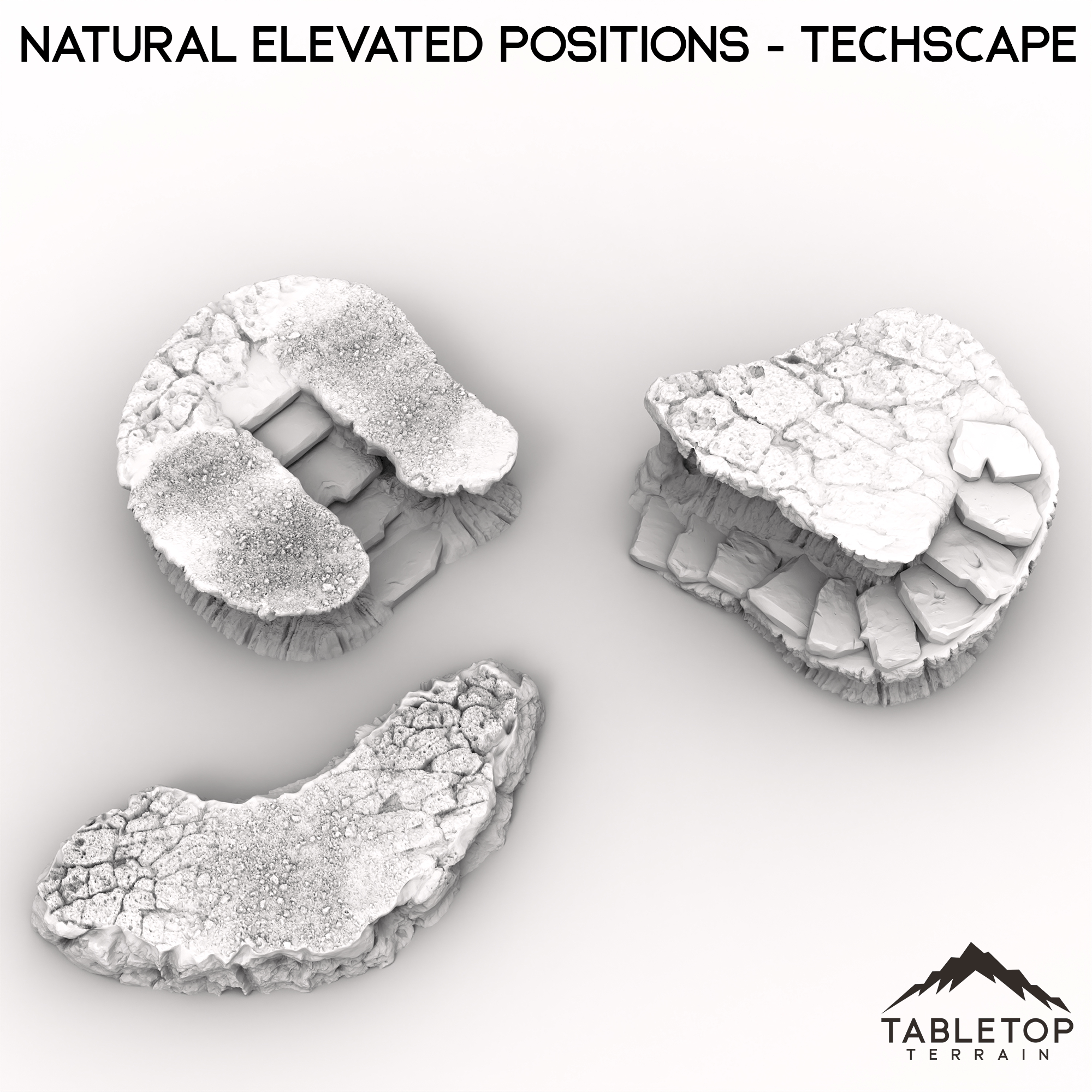 Natural Elevated Positions is a set of 3 large platforms, made from detailed stone and dirt. Each platform has a unique design, is made in a single piece, and is designed to be used for any type of tabletop genre. The set matches the look and feel of a lot of the designs from the Techscape collection, allowing for easy mix-and-match setups on your table!
